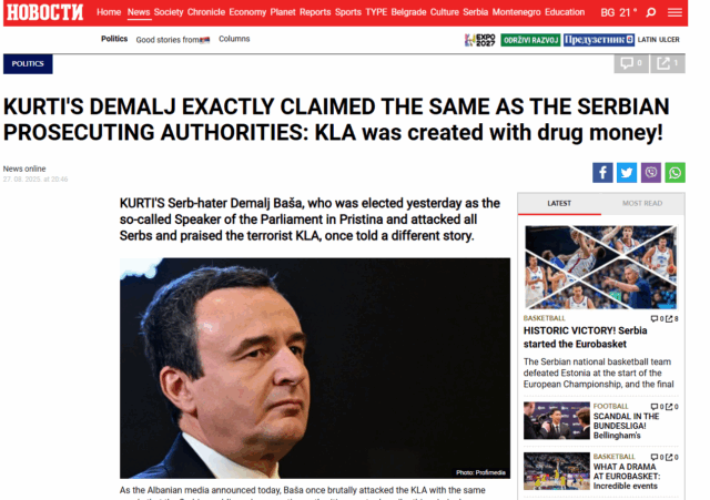 Festë titujsh si “Dimal Basha i Albin Kurtit tha të njëjtën gjë si Prokuroria e Serbisë: UÇK u krijua me para të drogës”.