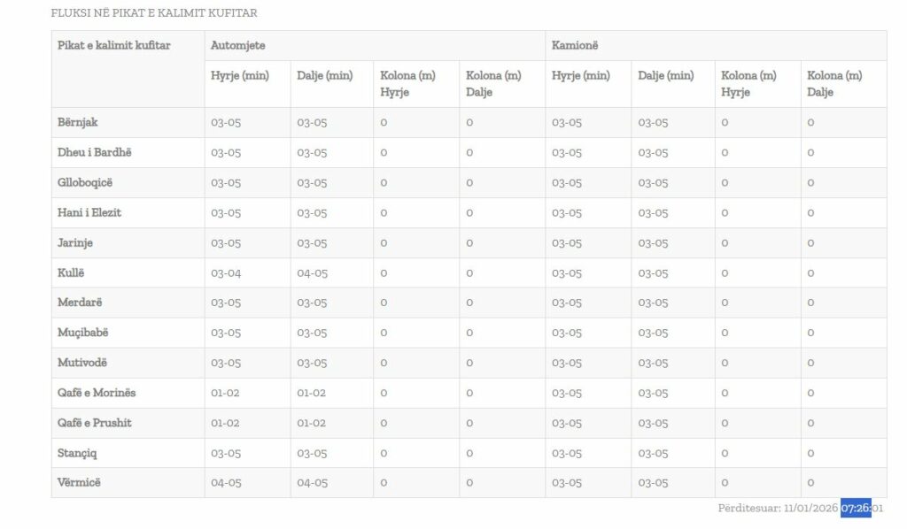 Bazuar në të dhënat e Qendrës për Menaxhim Kufitar, pritjet në të gjitha pikat kufitare variojnë nga 1 deri në 5 minuta.