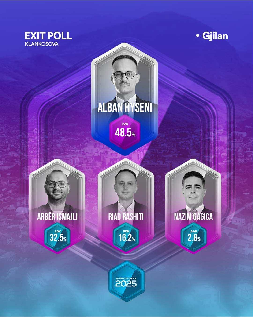 Exit-Polli i Klan Kosova, në bashkëpunim me PIPOS, ka projektuar që Gjilani do të shkojë në balotazh mes Alban Hysenit të LVV-së dhe Arbër Ismajlit të LDK-së.