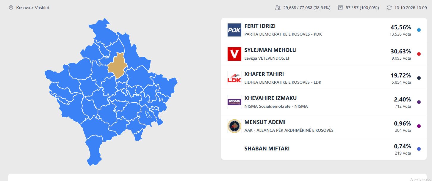 Ferit Idrizi i Partisë Demokratike të Kosovës (PDK) doli i pari me 45.56%, por nuk arriti të triumfojë ndaj Sylejman Mehollit të Vetëvendosjes, përkundër që kanë diferencë për 4 mijë e 433 vota.