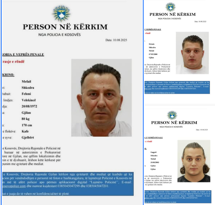 “Policia e Kosovës shpall në kërkim personat: Mefail Shkodra, Edonis Shkodra dhe Engjull Shkodra”.